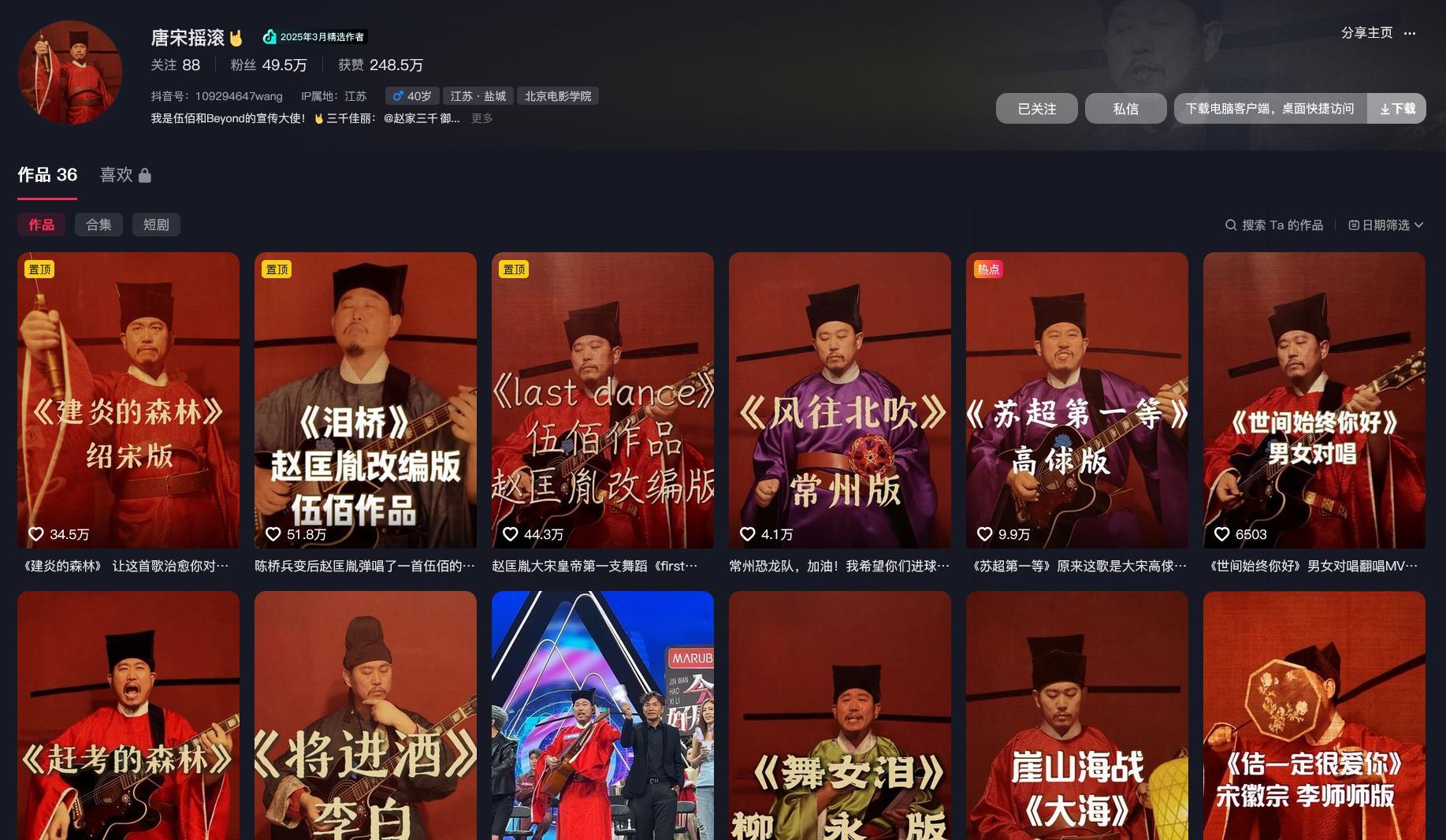 6月22日,极目新闻记者联系到“唐宋摇滚”。他本名王艺云,今年40岁,是盐城市响水县人,也是Beyond、伍佰、迪克牛仔等乐队及歌手的忠实粉丝。他曾是摄影师,也组建过乐队,今年以来凭借“唐宋摇滚”系列翻唱视频收获了数十万粉丝,其中就包括《苏超第一等》填词作者“温和的上校”。王艺云告诉记者,他原本不是球迷,不关注球赛,不过也想在盐城主场看一场“苏超”。