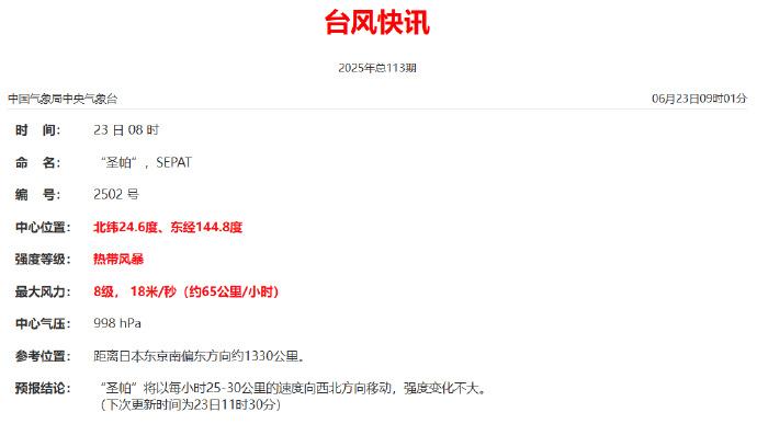 据@中国气象局 消息,今年第2号台风“圣帕”于23日8时在西北太平洋洋面上生成。