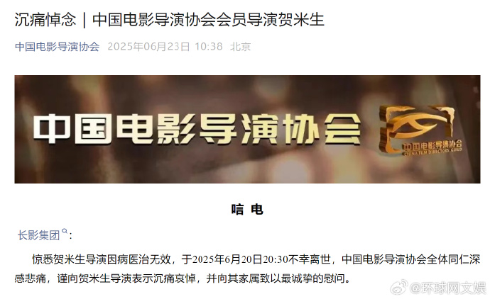 中国电影导演协会今日发文悼念导演贺米生:贺米生导演因病医治无效,于2025年6月20日20:30不幸离世,中国电影导演协会全体同仁深感悲痛,谨向贺米生导演表示沉痛哀悼,并向其家属致以最诚挚的慰问。