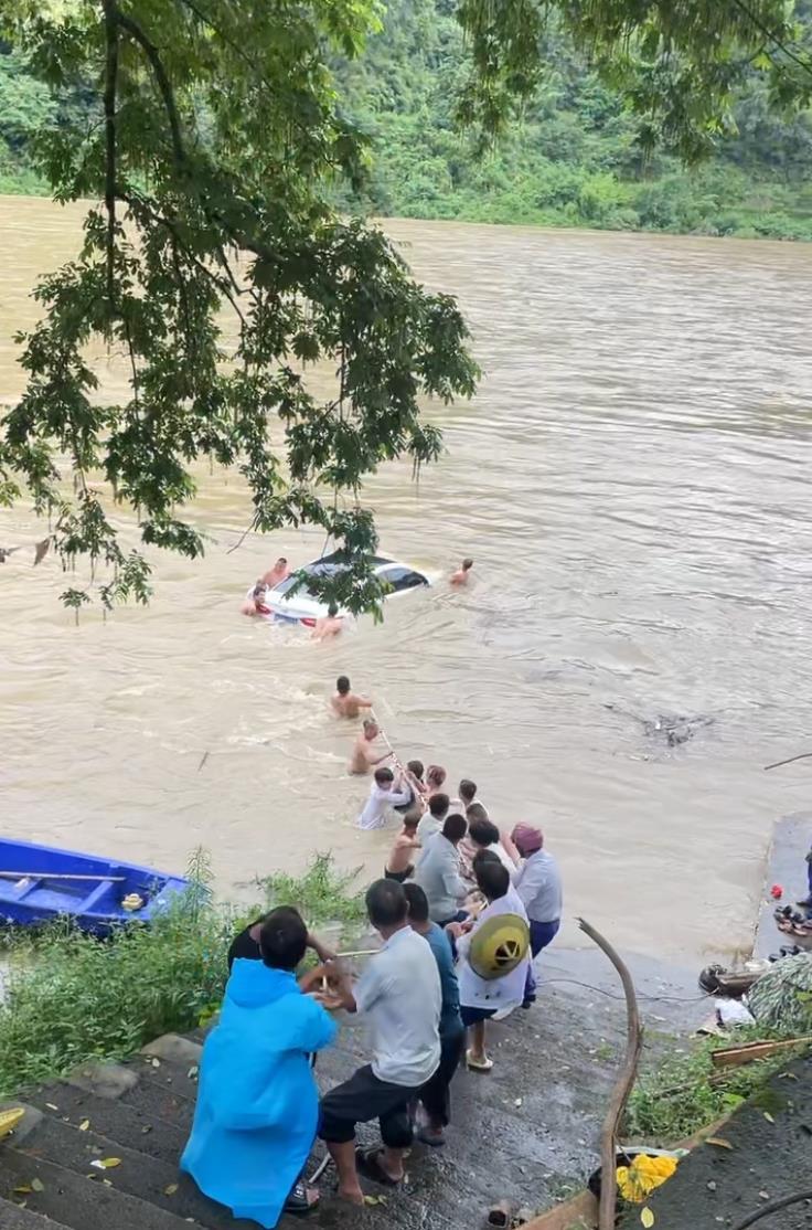 刘女士介绍,那几日,她的家乡举办龙舟节,被淹的白色轿车车主参加了划龙舟比赛,就将车停在清水江边的停车场上。没想到当天突发洪水,一个小时左右,车身就被淹没了一大半,车主无法及时赶回,村子里的村民就下水帮忙挪车,救援持续了半个多小时,被困的轿车被成功营救上岸。