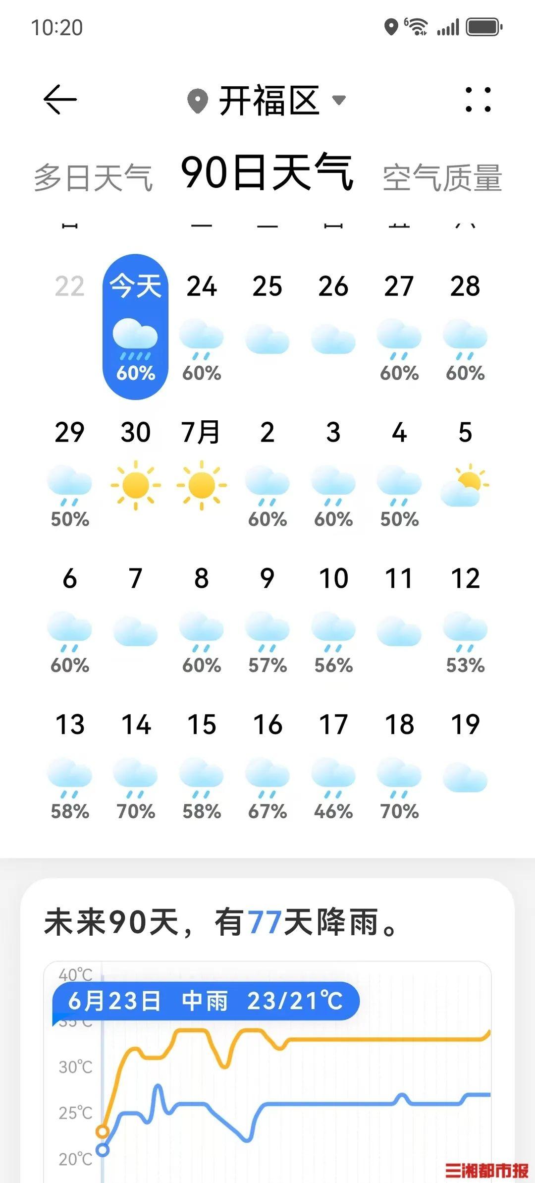 6月18日以来,湖南遭遇连续强降雨过程,这也引起不少市民对未来天气走势的担忧。有市民发现,天气APP预测未来90天长沙有77天会下雨,直呼“不可思议”。这是真的吗?