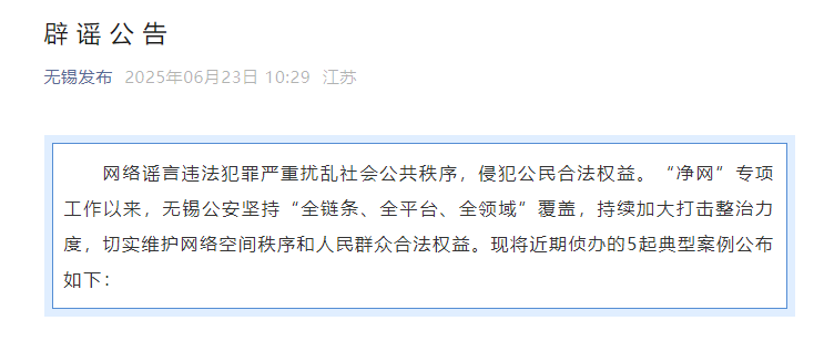 2025年3月,占某某为博取关注、吸引眼球,在网上编造“无锡马拉松野鸳鸯”男主为某公司高管的谣言信息。钱某为泄私愤,在网上编造“无锡马拉松野鸳鸯”女主为我市一居民的谣言信息。上述谣言在网上大量传播,扰乱公共秩序,造成不良社会影响。占某某、钱某已被公安机关行政处罚。