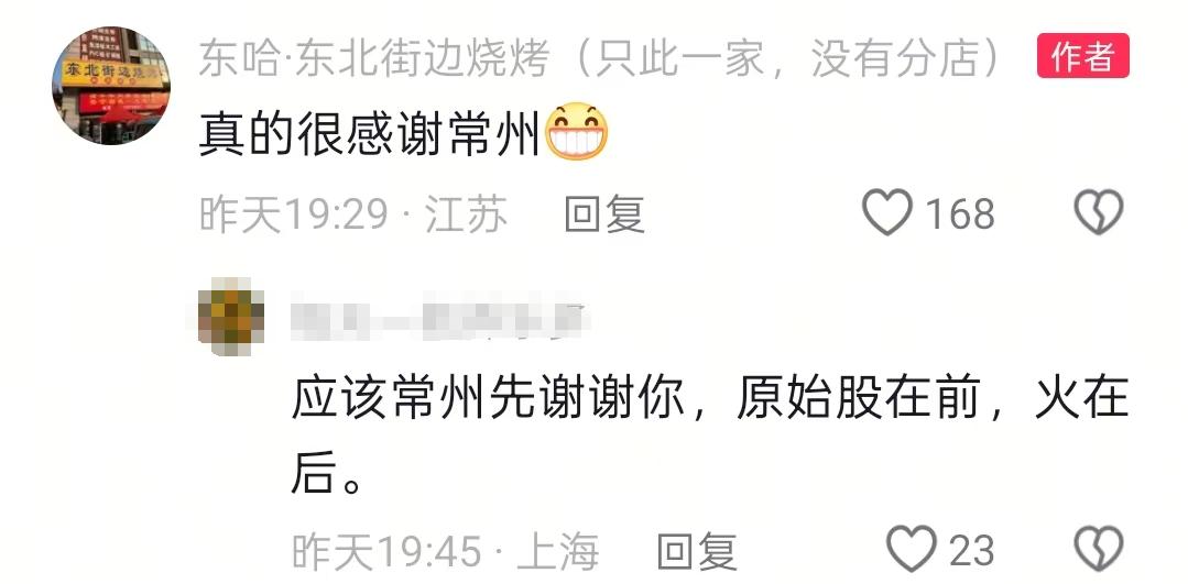 6月22日,东哈烧烤店老板发布在视频上回复了网友的部分疑问,老板张女士是哈尔滨人,在常州和丈夫一起经营着这家烧烤店。她在视频中解释道赞助的动机是源于家族对体育的热爱。小姑子的女儿今年上二年级,在常州市体校练体操。“感谢这座城市培养了孩子,我们也想为这座城市做点贡献。”