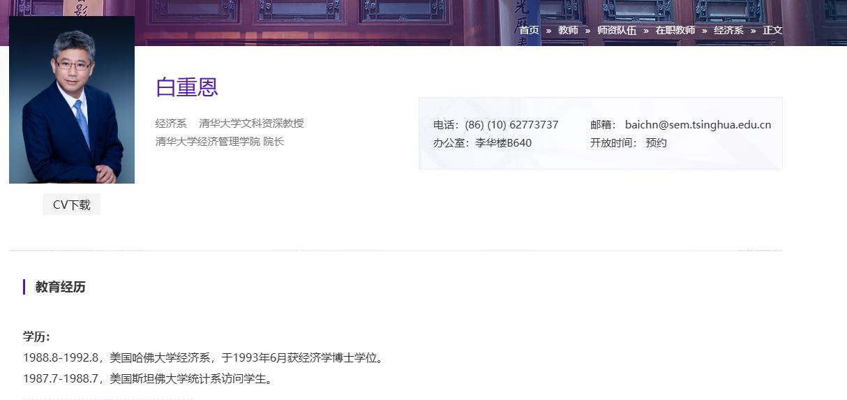 而清华大学官网资料显示,清华大学经济管理学院院长是著名经济学家、清华大学文科资深教授白重恩教授,而不是名叫“曹玉磊”的人士。