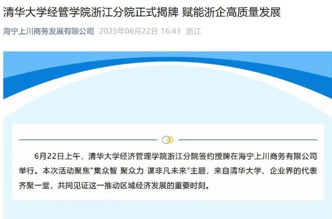 此前6月22日消息,多位网友举报,一个名为“海宁上川商务发展有限公司”的微信公众号发文《清华大学经管学院浙江分院正式揭牌 赋能浙企高质量发展》称,6月22日上午,清华大学经济管理学院浙江分院签约授牌在海宁上川商务有限公司举行。本次活动聚焦“集众智 聚众力 谋非凡未来”主题,来自清华大学、企业界的代表齐聚一堂,共同见证这一推动区域经济发展的重要时刻。文章提到,“仪式中,清华大学经管学院院长曹玉磊与桐生文化董事长陶云峰完成战略签约与分院授牌。”