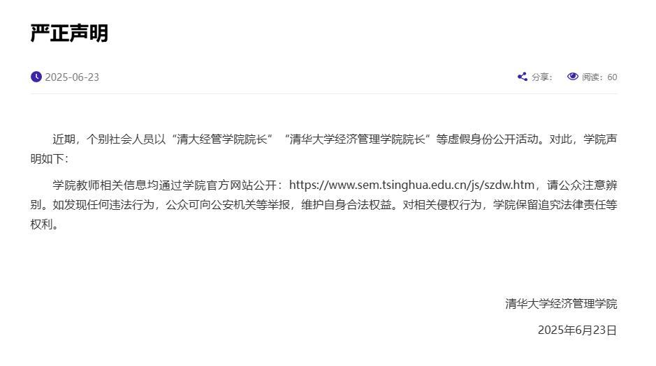 6月23日据清华大学官网,近期,个别社会人员以“清大经管学院院长”“清华大学经济管理学院院长”等虚假身份公开活动。对此,学院声明:学院教师相关信息均通过学院官方网站公开,请公众注意辨别。如发现任何违法行为,公众可向公安机关等举报,维护自身合法权益,对相关侵权行为,学院保留追究法律责任等权利。