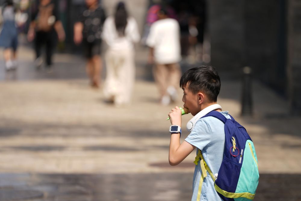 6月23日,在北京前门大街,一位小朋友在吃冷饮消暑。 新华社记者鞠焕宗摄