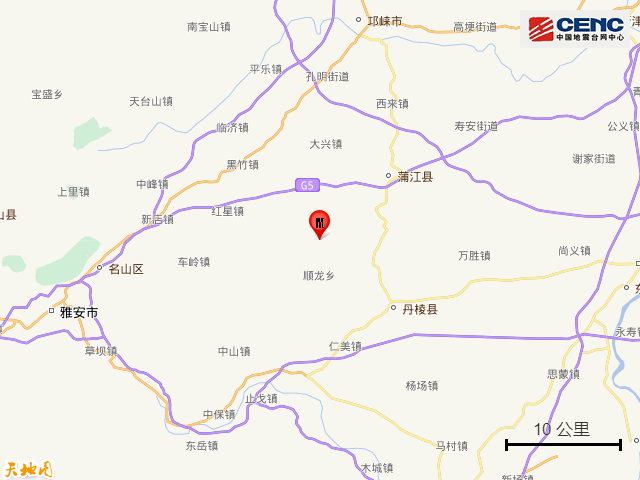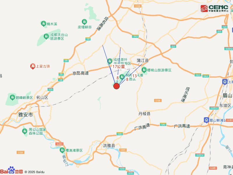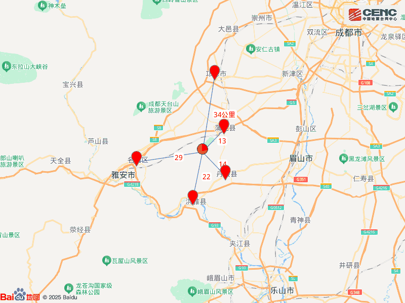 周边县城:震中距蒲江县13公里、距丹棱县14公里、距洪雅县22公里、距名山区29公里、距邛崃市34公里,距雅安市37公里,距成都市88公里。