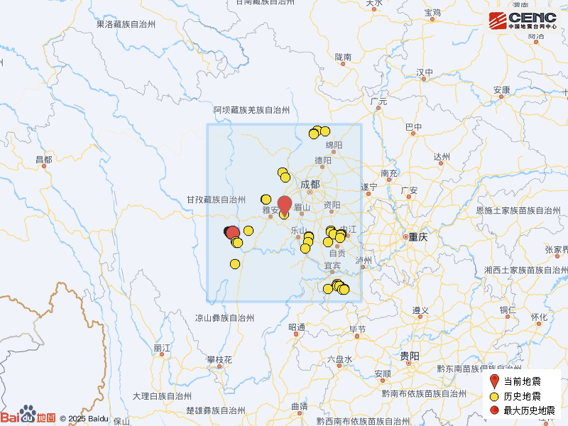 历史地震:根据中国地震台网速报目录,震中周边200公里内近5年来发生3级以上地震共201次,最大地震是2022年9月5日在四川甘孜州泸定县发生的6.8级地震(距离本次震中141公里),按震级大小前50次历史地震分布如图。