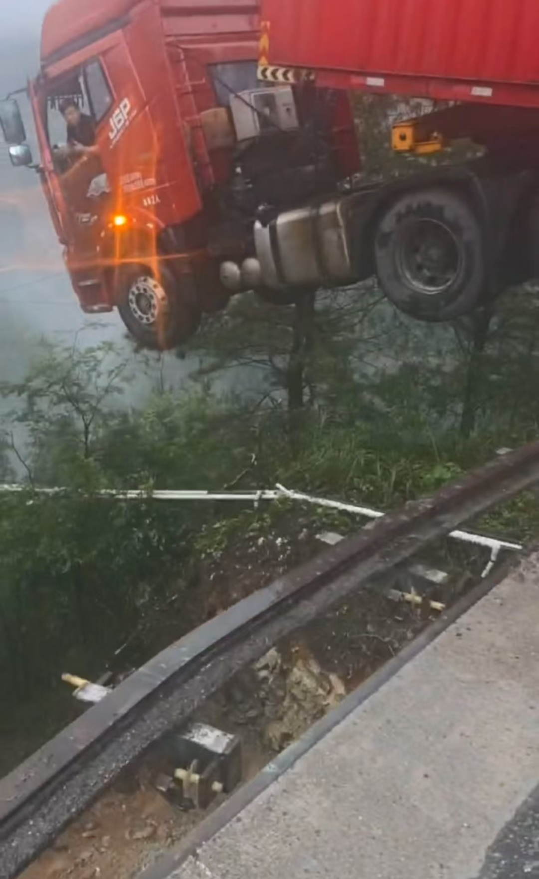 有视频显示,一红色货车车头已经腾空,车身还留在路面,货车司机尚待在车头。路上的人对司机喊“你命大啊危险啊!只能等消防来啊!没信号!”并称下方已经有两辆小车掉落。司机劝该路人不要再往前,该路人随即发现路面有开裂,迅速往后撤。