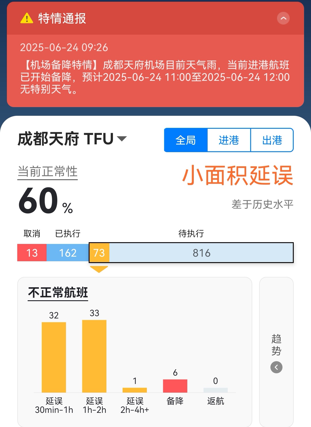 截至24日上午10时,天府机场的航班正常率为60%,有小面积航班延误。其中6个进港航班出现备降,分别自长沙、杭州、广州、昆明等地至成都天府国际机场航班。