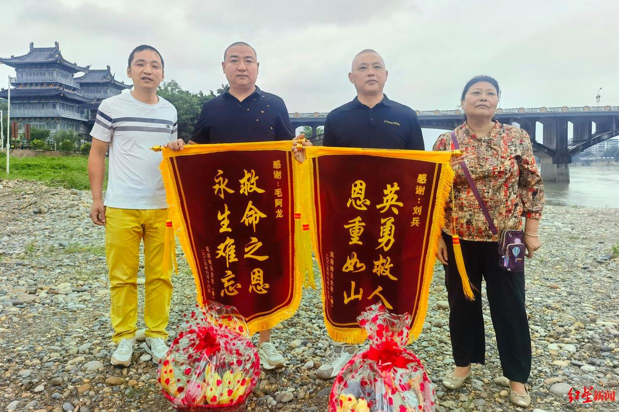 8天前,熊正华的儿子吴路崎在江边戏水纳凉时不慎溺水。危急时刻,两名黑衣男子挺身而出,纵身跃入水中接力将其救起,最后默默地离开了现场。经过多方寻找,母子两人终于见到了救命恩人,送上了锦旗和水果表达谢意。