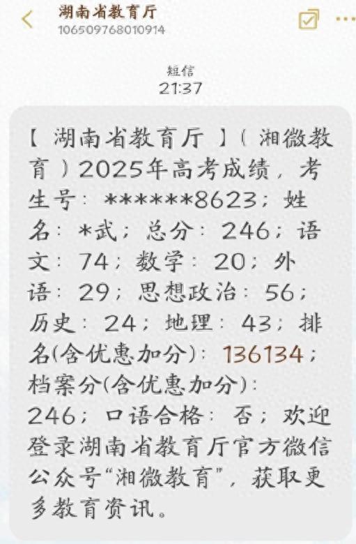 “大家好!我之前叫朱雀玄武敕令,现在叫周景明,高考准考证姓名是朱雀玄武,是湖南省桂阳县人。本人今晚在潇湘高考app查了一下我今年的高考成绩,我的总分是246分,分别是语文74分,数学20分,外语29分,政治56分,历史24分,地理43分。虽然这次高考分数跟我预想的三百多分有一定差距,但是本人内心还是很平静。因为我查了一下往年高考高职专科录取情况,我的这个分数保底可以去新疆的两所职业学院,分别是喀什职业技术学院,可克达拉职业技术学院。之前我都去西藏职业技术学院上过学,这次如果被新疆的职业学院顺利录取,我也会去上大学,反正我是有书读了。”