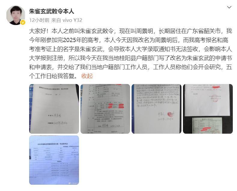 另外,据@朱雀玄武敕令本人微博发布信息显示:因其改名原因,会导致大学录取通知书无法签收,会影响其大学报到注册,所以今天在当地桂阳县户籍部门写了改名为朱雀玄武的申请书和申请表,并交给了当地户籍部门工作人员。以下为全文内容: