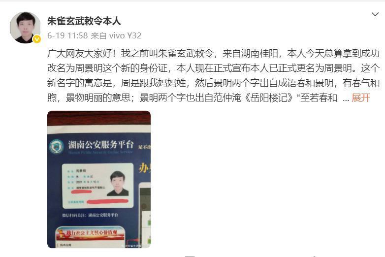 6月19日,“朱雀玄武敕令”通过个人社交媒体发布消息,称自己已经改名为“周景明”,并已经成功拿到了身份证。