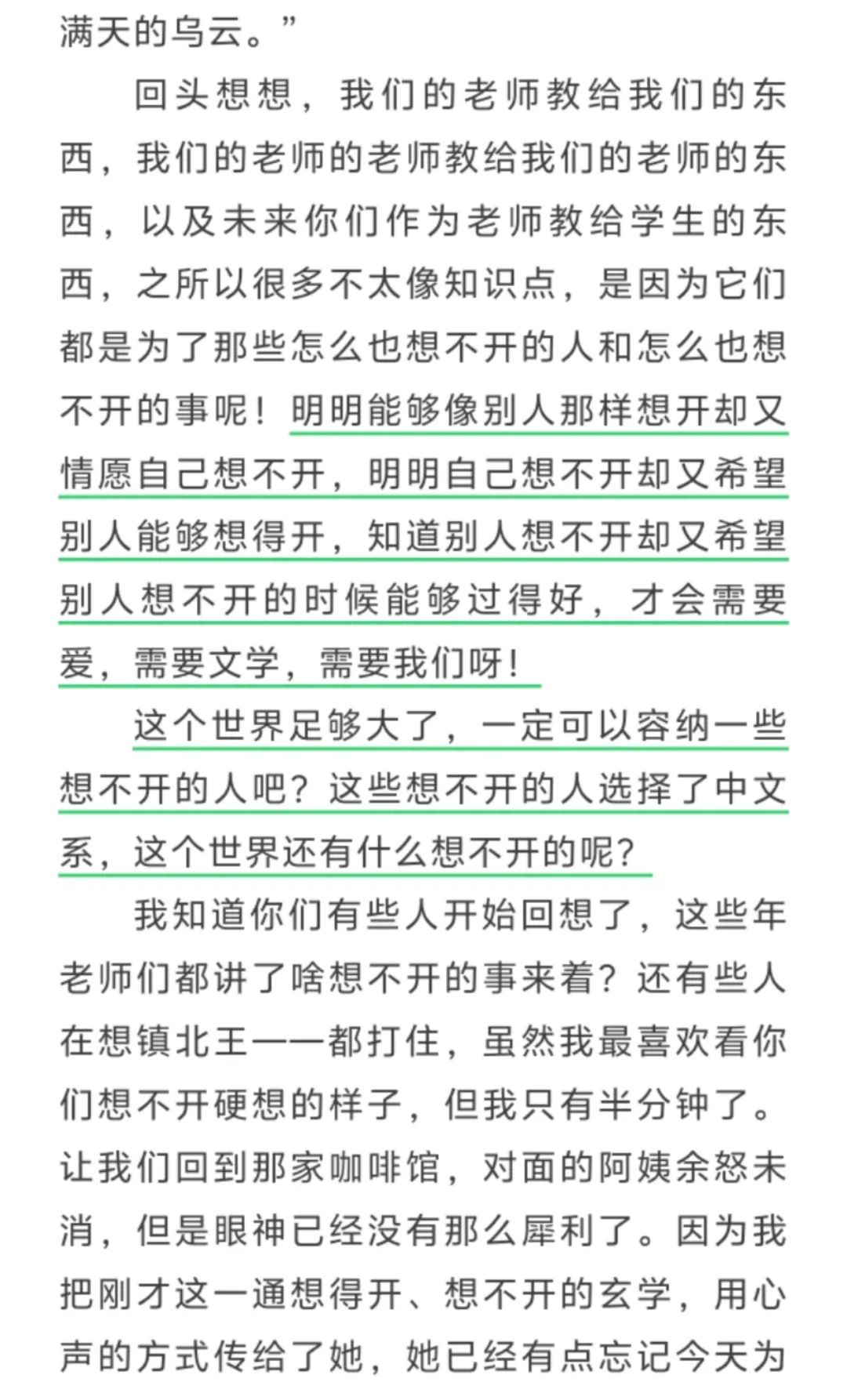 “这个世界足够大了,一定可以容纳一些想不开的人吧?这些想不开的人选择了中文系,这个世界还有什么想不开的呢?”字里行间,既有短剧、穿越文中的网络热梗,又不乏温柔而细腻的情感表达。