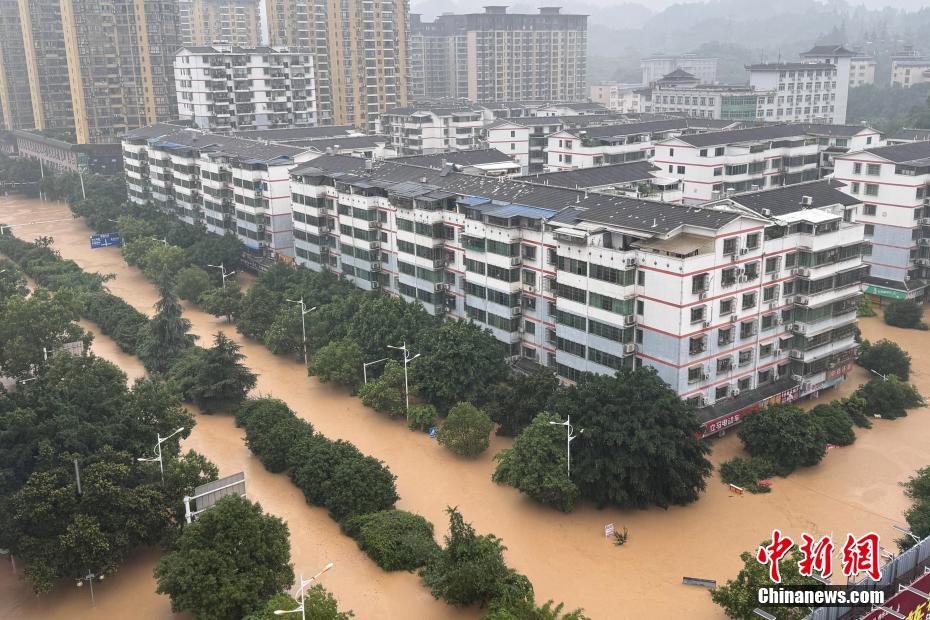 6月23日至24日,贵州省黔东南州榕江县遭遇持续性强降雨。当前,县内平永河、寨蒿河、都柳江水位持续快速上涨。图为6月24日,榕江县城道路被淹。 中新社记者袁超摄