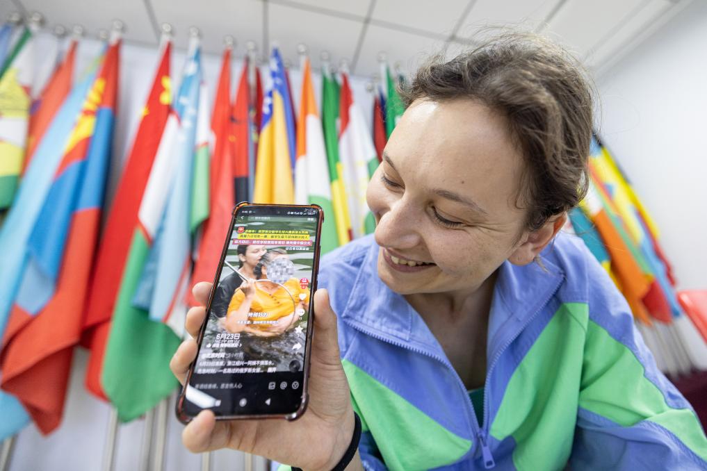 ↑2025年6月23日,莎河娜斯展示社交平台对她救助落水老人的报道。