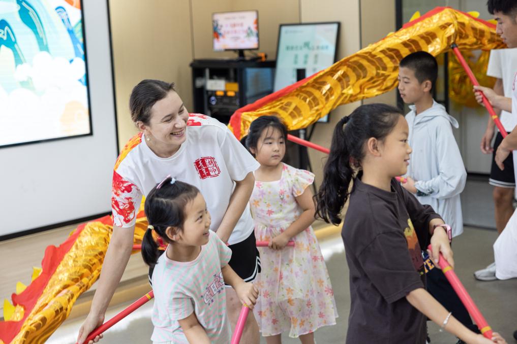 ↑2024年7月8日,莎河娜斯在湖州市一个公益暑期班教小朋友舞龙。
