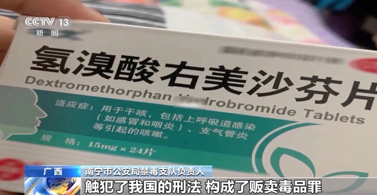 南宁市公安局禁毒支队民警:这个主要犯罪嫌疑人韦某,在售卖右美沙芬的时候,她为了规避公安机关的打击,首先是将出售的右美沙芬片的外包装用一些其他的盒子、药盒来伪装。第二个,她是只卖熟人,第三个特点,她会在线上来跟购买人员联系,然后通过线下用同城快送的方式,来将右美沙芬送至这个购买人员的手中。