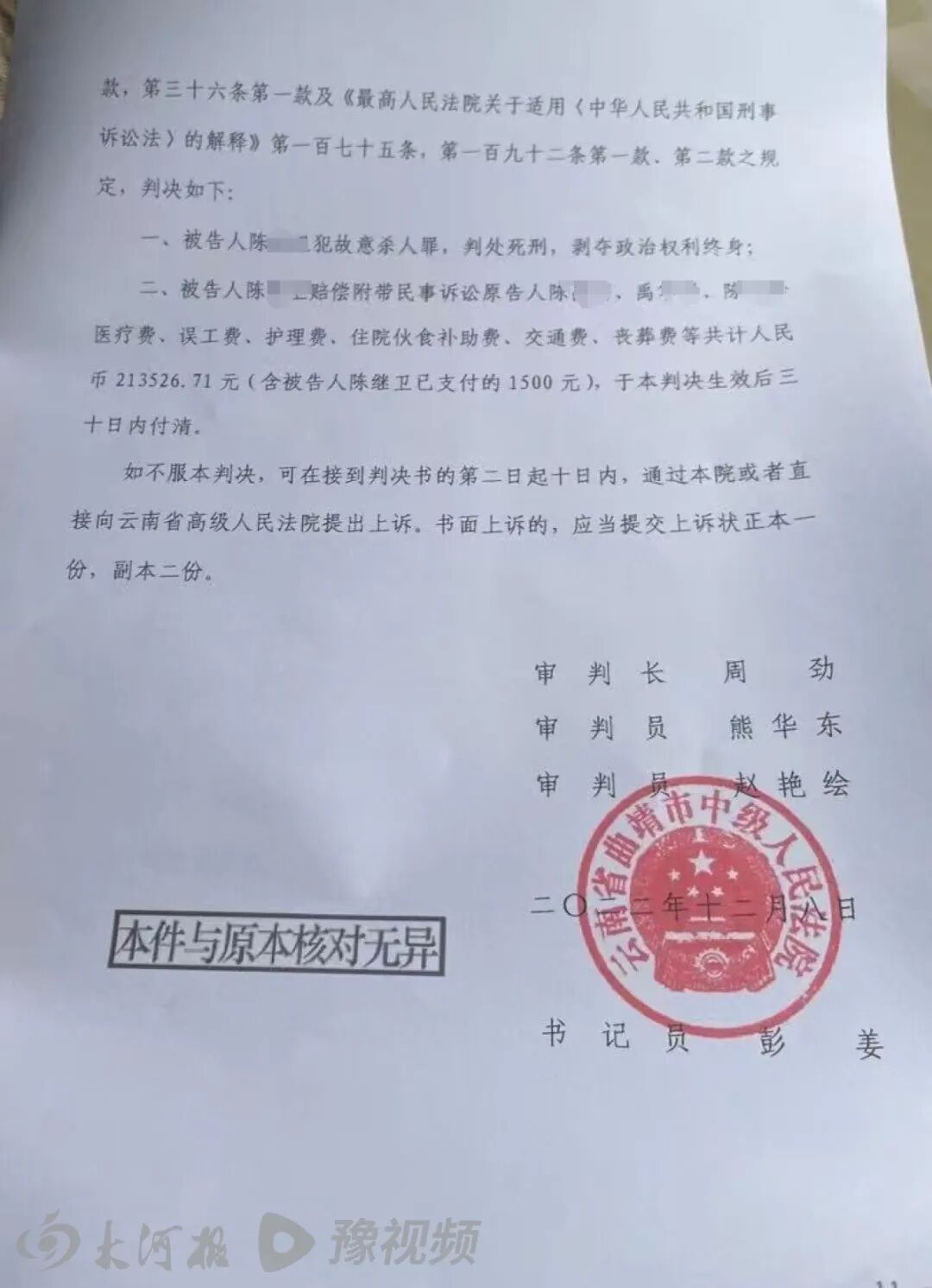 在该案中,陈昌雨既是被告人家属也是受害人家属。2021年3月14日,陈昌雨的父亲陈某某因家庭矛盾将汽油泼向陈昌雨的母亲禹某某并点燃,致其全身55%烧伤。禹某某经历4个月救治后,因伤口感染中毒休克死亡。2022年12月,曲靖市中级人民法院一审以故意杀人罪判处陈某某死刑,陈某某提出上诉。2024年2月,云南省高级人民法院二审裁定驳回上诉,维持死刑判决。