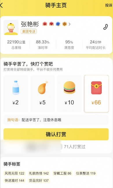 记者了解到,为表扬张艳彬的暖心事迹,美团外卖为他颁发了“先锋骑手”荣誉称号以及现金奖励。张艳彬所属配送站点的庄站长介绍道:“艳彬是个很有责任心的骑手,工作认真,为人善良,好评率高。获得用户这么大的肯定,我们都为他骄傲。”