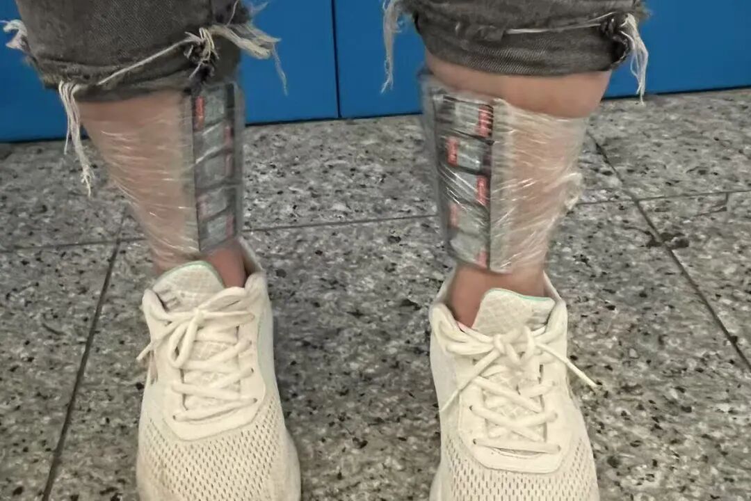 当日,皇岗海关关员在福田口岸对进境旅客及其行李物品进行监管时,发现一名女性旅客进入海关监管区未向海关申报,且神情紧张、步履匆忙。海关关员随即对其进行拦截检查,在该旅客的左、右小腿处分别查获用透明保鲜膜缠绕固定的SWITCH游戏卡60张、45张。