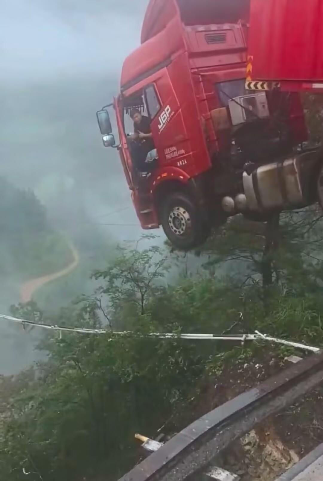 “我就打着伞下车看是怎么一回事,结果发现是高速公路的大桥垮了,一辆闪着灯的红色货车车头悬空停放在断桥处,特别危险。”梁足良回忆,他的车与红色大货车之间大约还有4辆车,他走过去时一边拍摄一边与货车司机随意聊了几句,然后返回阻止后续车辆继续前行,并将不远处一个隧道内的锥桶拿出来放在距离事发处约200米外,用以阻挡后续车辆前行,以防止发生危险。