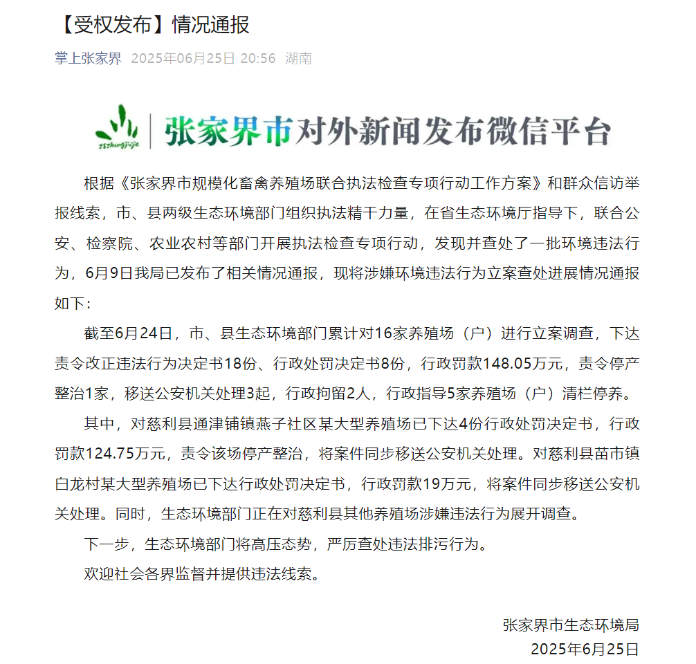 其中,对慈利县通津铺镇燕子社区某大型养殖场已下达4份行政处罚决定书,行政罚款124.75万元,责令该场停产整治,将案件同步移送公安机关处理。对慈利县苗市镇白龙村某大型养殖场已下达行政处罚决定书,行政罚款19万元,将案件同步移送公安机关处理。同时,生态环境部门正在对慈利县其他养殖场涉嫌违法行为展开调查。