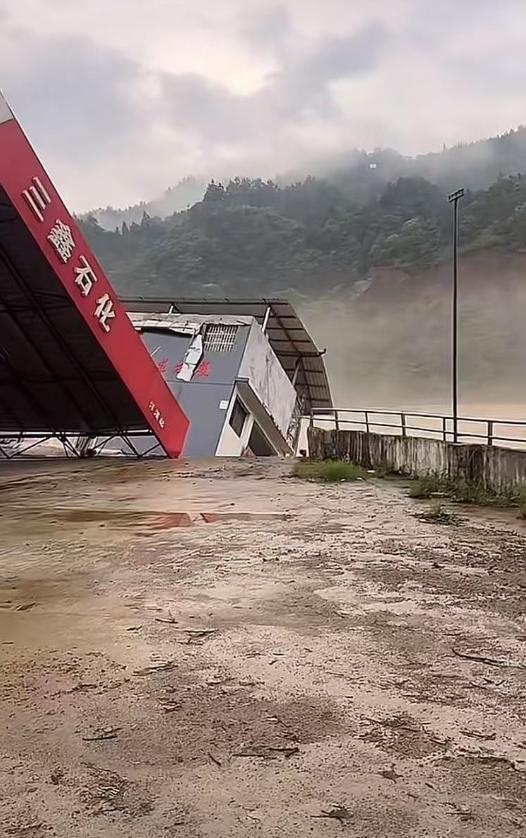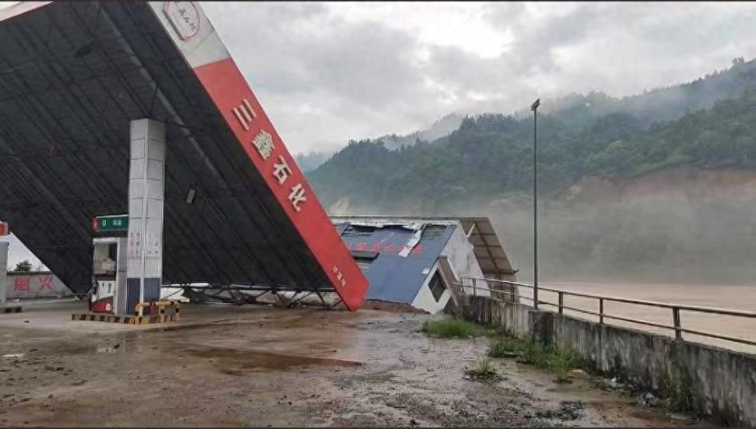 6月25日,有网友发布现场视频称,这家名为“三鑫石化”的加油站建在江边,地基被洪水冲垮,加油站房屋在众人惊呼中慢慢坠入洪水中。