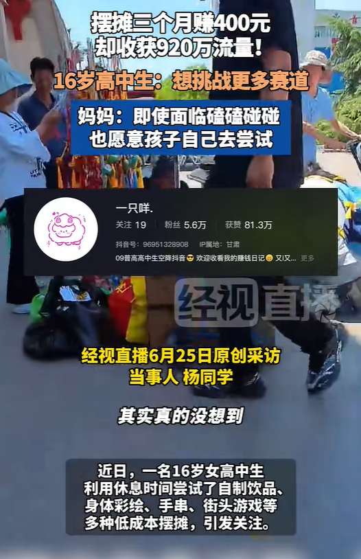 近日,16岁女高中生业余时间测评低成本摆摊火了。6月25日,当事人杨同学告诉经视直播记者,她来自甘肃兰州,目前就读高一。尝试摆摊创业和拍摄视频,主要是为了“给自己找点事干,万一有好的机遇和发展空间呢”?