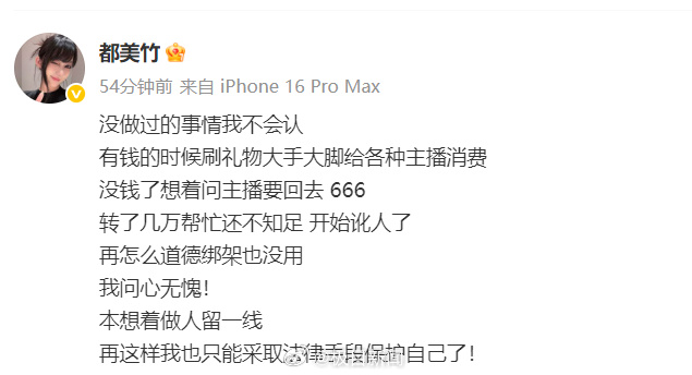 都美竹本人在评论区回应称:“没做过的事情我不会认,有钱的时候刷礼物大手大脚给各种主播消费,没钱了想着问主播要回去,转了几万帮忙还不知足,开始讹人了,再怎么道德绑架也没用。我问心无愧!本想着做人留一线。再这样我也只能采取法律手段保护自己了!”