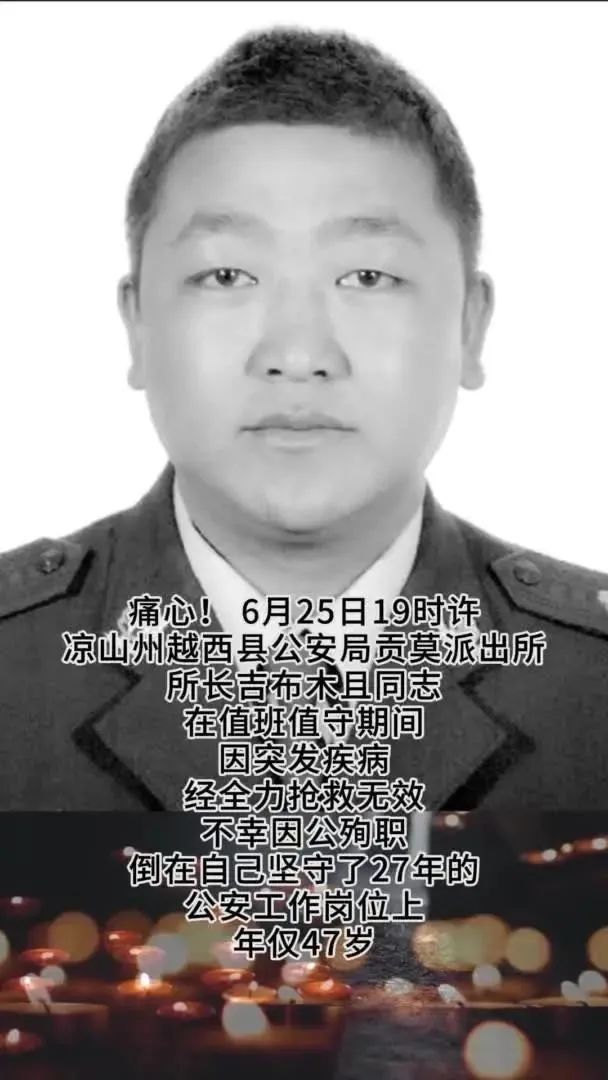 2025年6月25日19时许,凉山州越西县公安局贡莫派出所所长吉布木且同志在工作期间,因突发疾病,经全力抢救无效,不幸因公殉职,终年47岁。