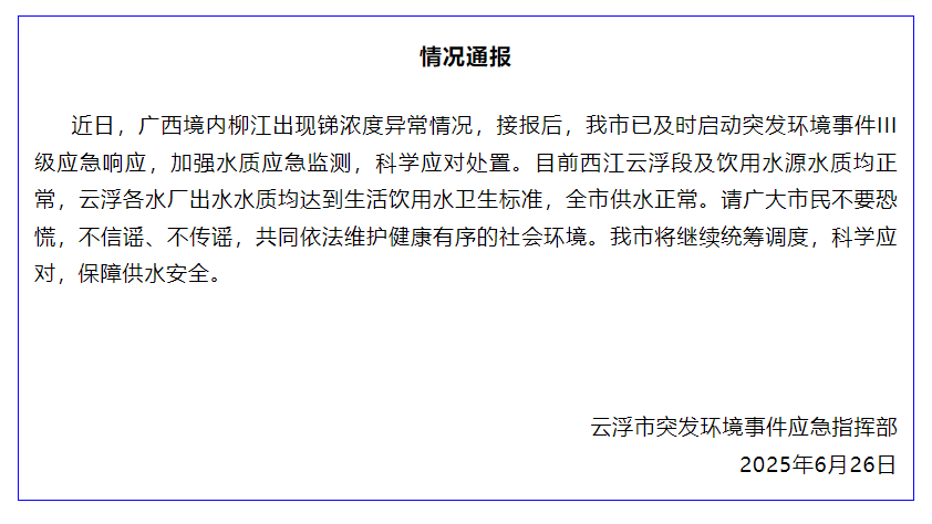 近日,广西境内柳江出现锑浓度异常情况,接报后,我市已及时启动突发环境事件III级应急响应,加强水质应急监测,科学应对处置。目前西江云浮段及饮用水源水质均正常,云浮各水厂出水水质均达到生活饮用水卫生标准,全市供水正常。请广大市民不要恐慌,不信谣、不传谣,共同依法维护健康有序的社会环境。我市将继续统筹调度,科学应对,保障供水安全。