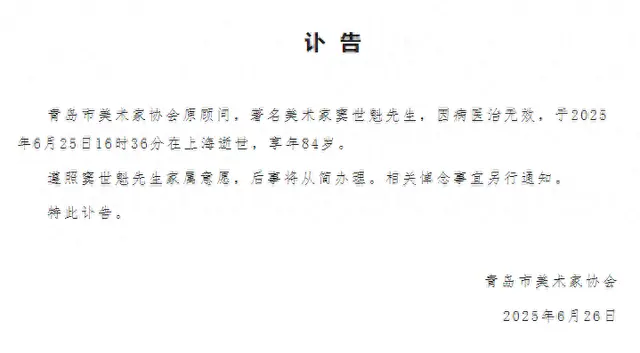 6月26日,青岛市美术家协会发布讣告:青岛市美术家协会原顾问,著名美术家窦世魁先生,因病医治无效,于2025年6月25日16时36分在上海逝世,享年84岁。