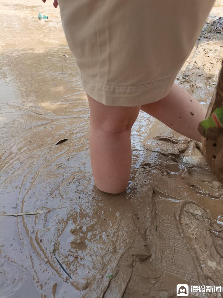 车子开出不久,就到了封控路段。记者下车,决定步行赶往县城。途中,通讯信号渐弱,地面残留着10厘米多厚的淤泥,一步踏出去,直陷到脚踝,记者需要很用力才能拔出来,就这么一步一陷,边打滑边往前走。