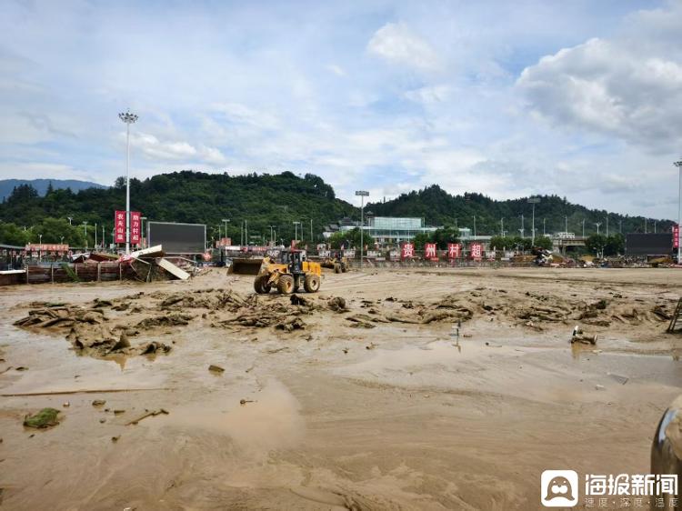 24日下午起,两台铲车开进“村超”足球场开始清淤,救援队伍也加入其中。在球场清淤的一名蓝天救援队队员告诉记者:“我们是从四川赶过来的,当时淤泥差不多到大腿的位置。”