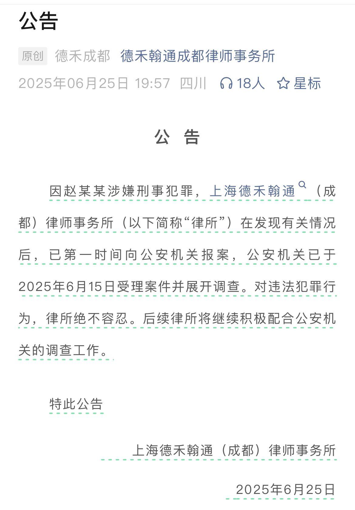 记者注意到,6月25日,上海德禾翰通(成都)律师事务所发布公告称,因赵某某涉嫌刑事犯罪,律所在发现有关情况后,已第一时间向公安机关报案。公安机关已于2025年6月15日受理案件并展开调查。对违法犯罪行为,律所绝不容忍。后续律所将继续积极配合公安机关的调查工作。