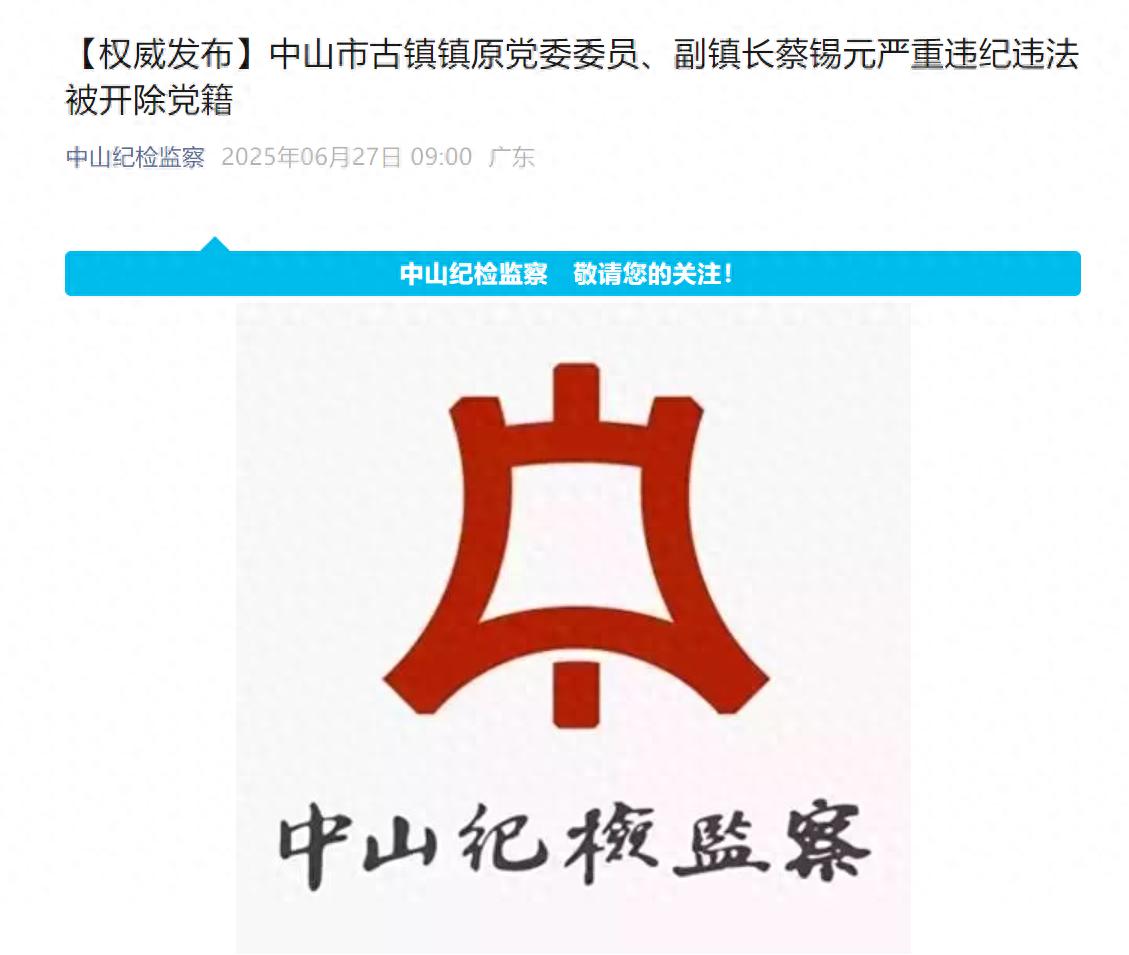 据中山纪检监察消息:日前,中山市纪委监委对中山市古镇镇原党委委员、副镇长蔡锡元严重违纪违法问题进行了立案审查调查。