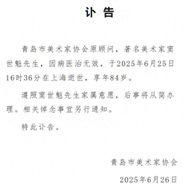6月26日,青岛市美术家协会发布讣告:青岛市美术家协会原顾问,著名美术家窦世魁先生,因病医治无效,于2025年6月25日16时36分在上海逝世,享年84岁。