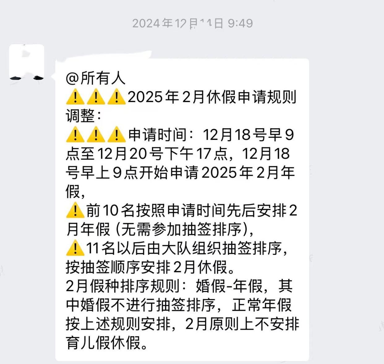 “这个文件,内部发文日期是2024年9月25日,属于先执行后补文件。另外,按照文件,探亲假是不需要摇号的,但是每次申请都说‘没名额’,其他人谁休了我不清楚,我在离职前的这两年是没休过。”他说。