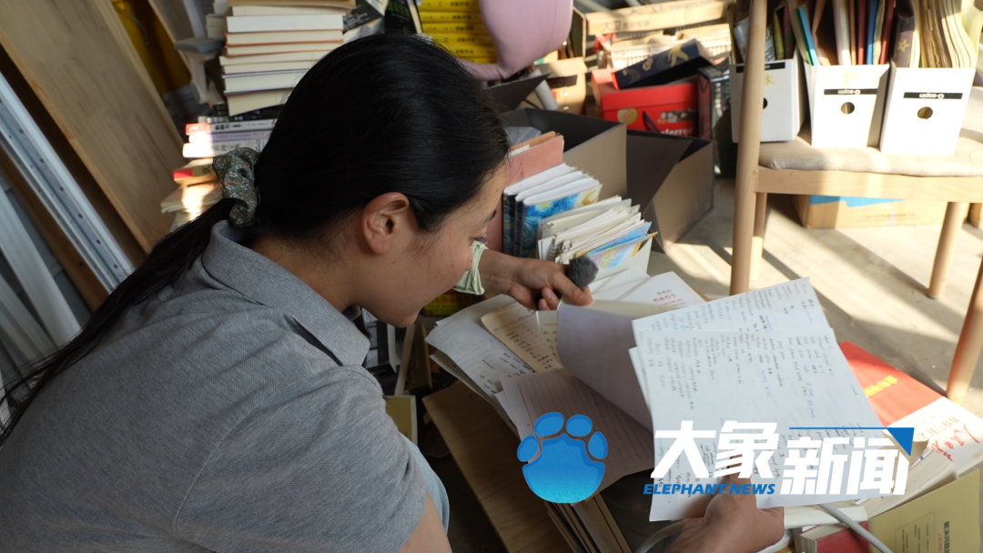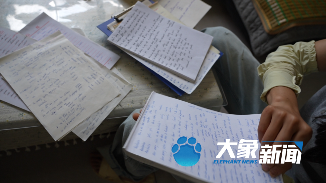 书籍中还夹杂着成摞的稿纸,除了福贵自己写的文案,还有一大摞稿纸上密密麻麻写着英文单词。