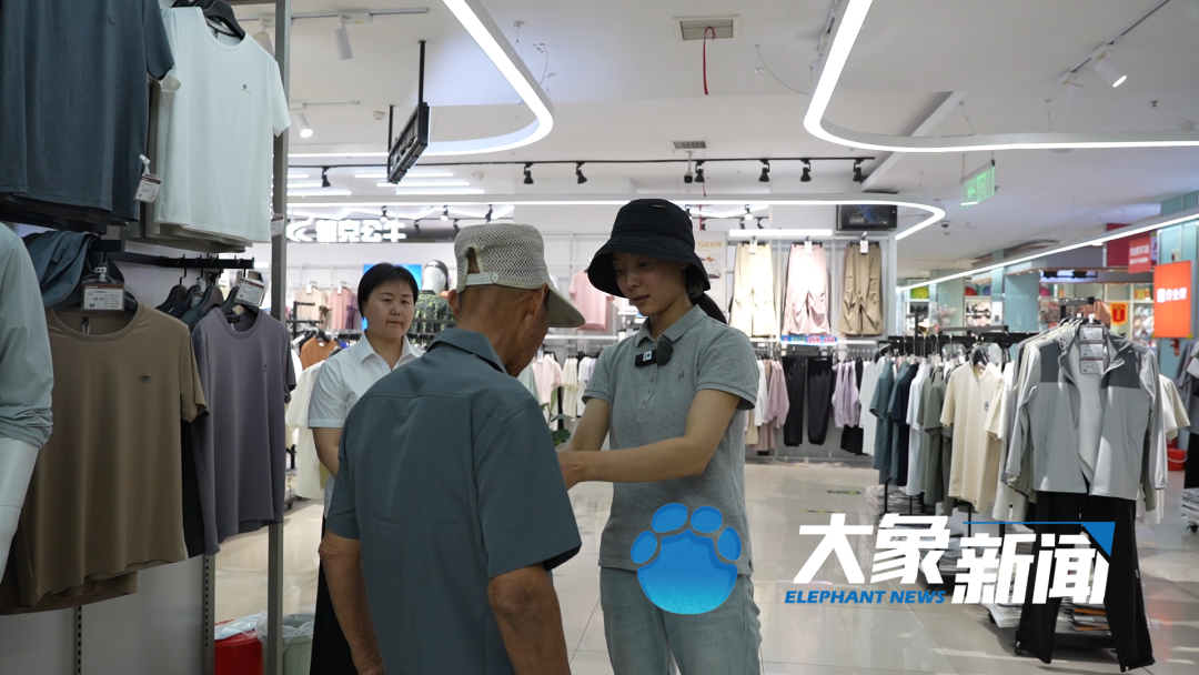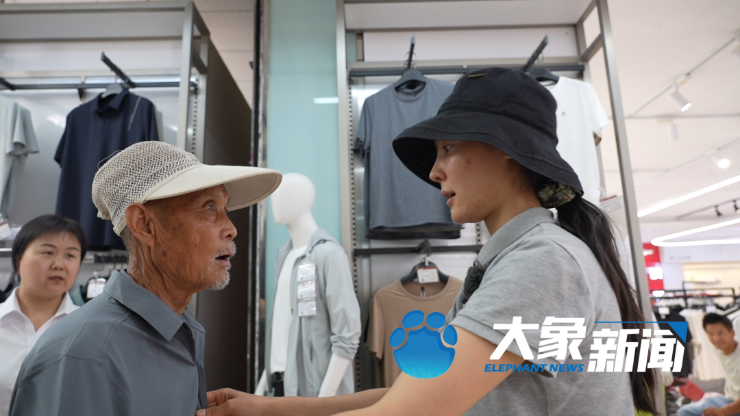 在卫辉市区健康路上的建业商场,富贵给爷爷买了一件半截袖和一条裤子,花了108块钱。
