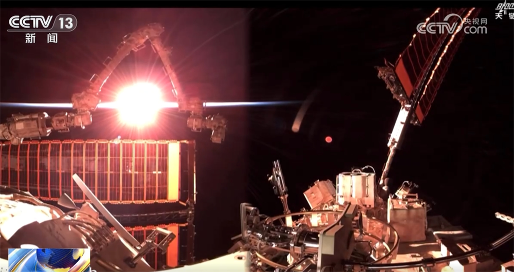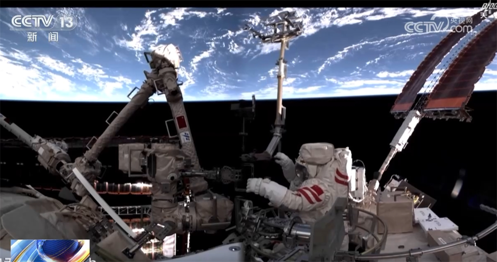 机械臂运动至上下臂点,陈中瑞登上机械臂,到防护装置安装点,陈冬在出舱舱口将热控防护装置传递给陈中瑞,开始进行安装操作。