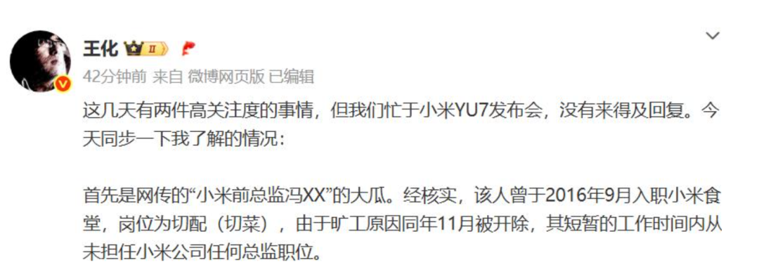 6月27日,小米@王化发文回应近日舆论。全文如下: