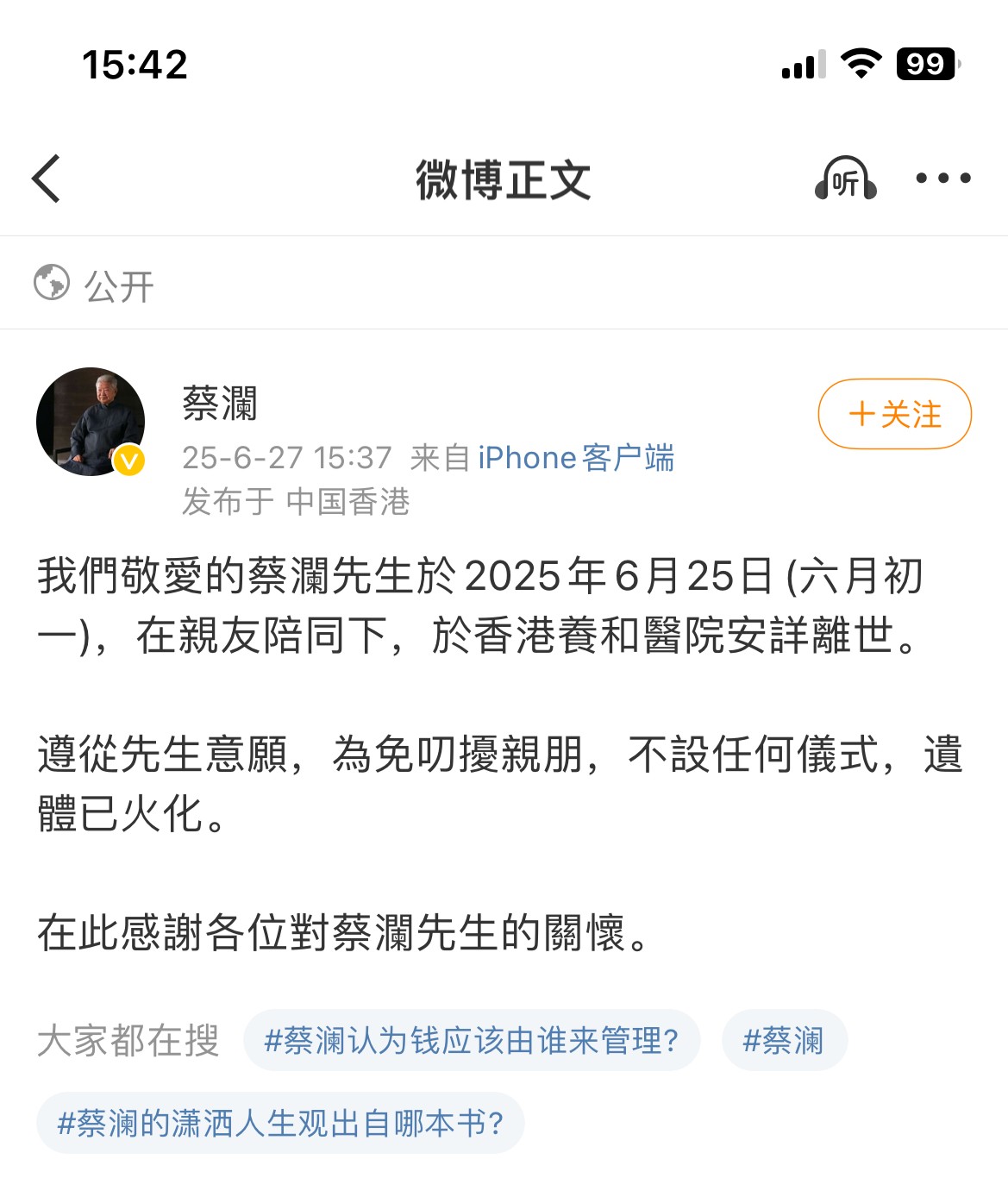 6月27日下午15:37,蔡澜微博发布讣告,表示蔡澜已于6月25日在香港养和医院去世。讣告表示,遵从先生遗愿,为免叨扰亲朋,不设任何仪式,遗体已火化。