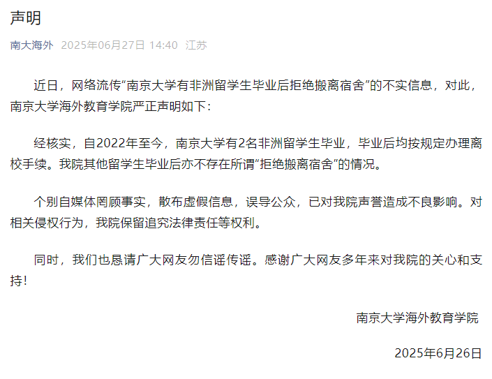 近日,网络流传“南京大学有非洲留学生毕业后拒绝搬离宿舍”的不实信息,对此,南京大学海外教育学院严正声明如下: