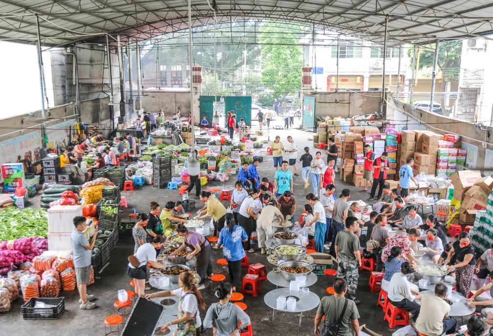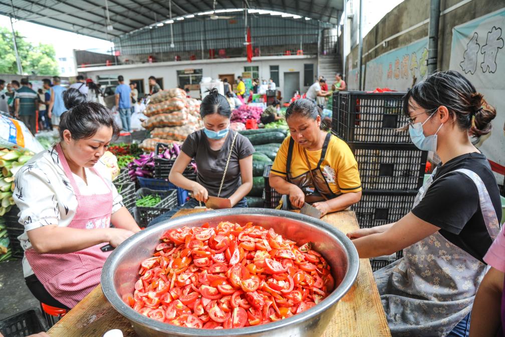 ↑6月27日,村民在忠诚镇一处后勤伙食保障点切菜。