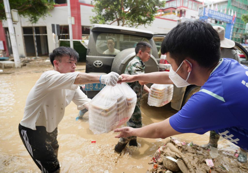 ↑6月26日,工作人员将盒饭送到救灾一线。