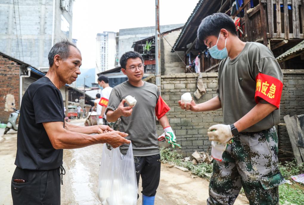 ↑6月27日,村民(左)把蒸好的馒头送到救援人员手中。